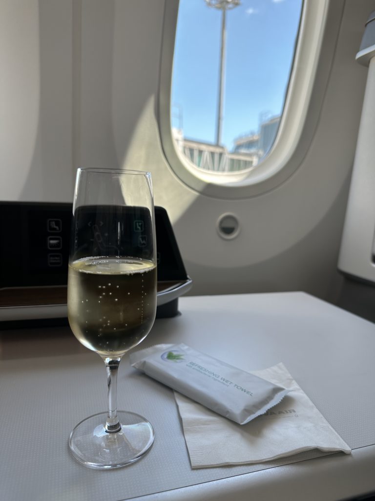 搭乗直後にスパークリングワインを楽しんで出発を待ちます♪